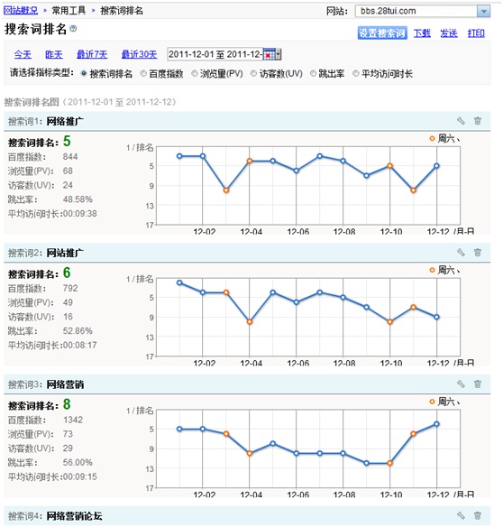 在“搜索詞排名”這個(gè)功能上,功能是非常實(shí)用的,只要使用百度統(tǒng)計(jì),輸入搜索詞,就能管理你的網(wǎng)站每天搜索詞排名情況。下圖為搜索詞排名報(bào)告頁(yè)面的截圖,非常明了。
