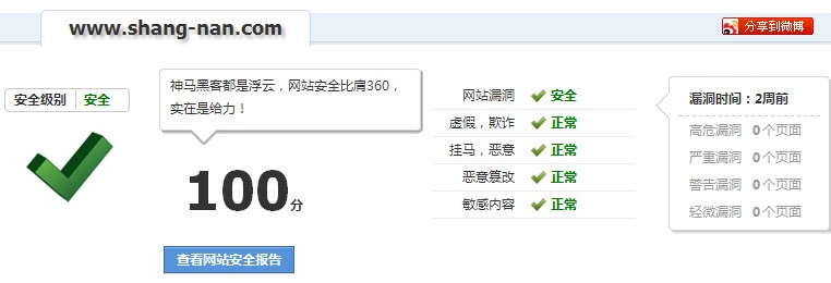 三、網站木馬檢測方法網站木馬檢測方法我們推薦使用360網站安全檢測工具,在網上搜索下“360網站安全檢測工具”,打開網站,輸入您的網址就可以檢測了,方法非常的簡單、易用,不需要專業人士的指導就可以檢測出網站的健康狀況。檢測分數一定要在85分以上才算可以,我們的網站檢測分數都是100分。