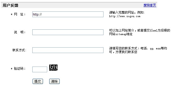 2、在搜狗網站提交頁面分別填寫:網址、說明、聯系方式、驗證碼,確認填寫無誤后點擊“提交”按鈕即可。