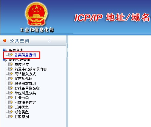 在打開的頁面中,左側(cè)有一列導(dǎo)航鏈接,點擊最上面的“備案信息查詢”,如下圖