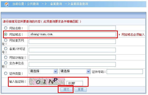 在頁面右邊會出現(xiàn)查詢條件窗口中輸入查詢條件及驗證碼,點擊“提交”即可。以按照“網(wǎng)站域名”查詢?yōu)槔缦聢D